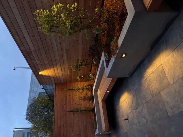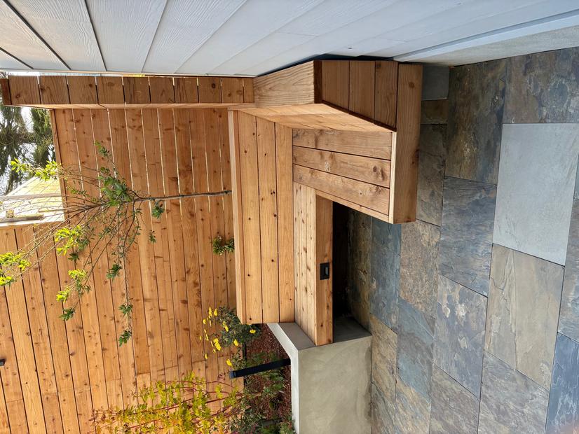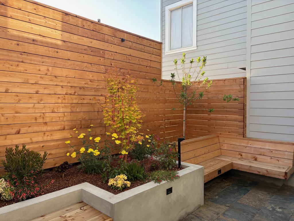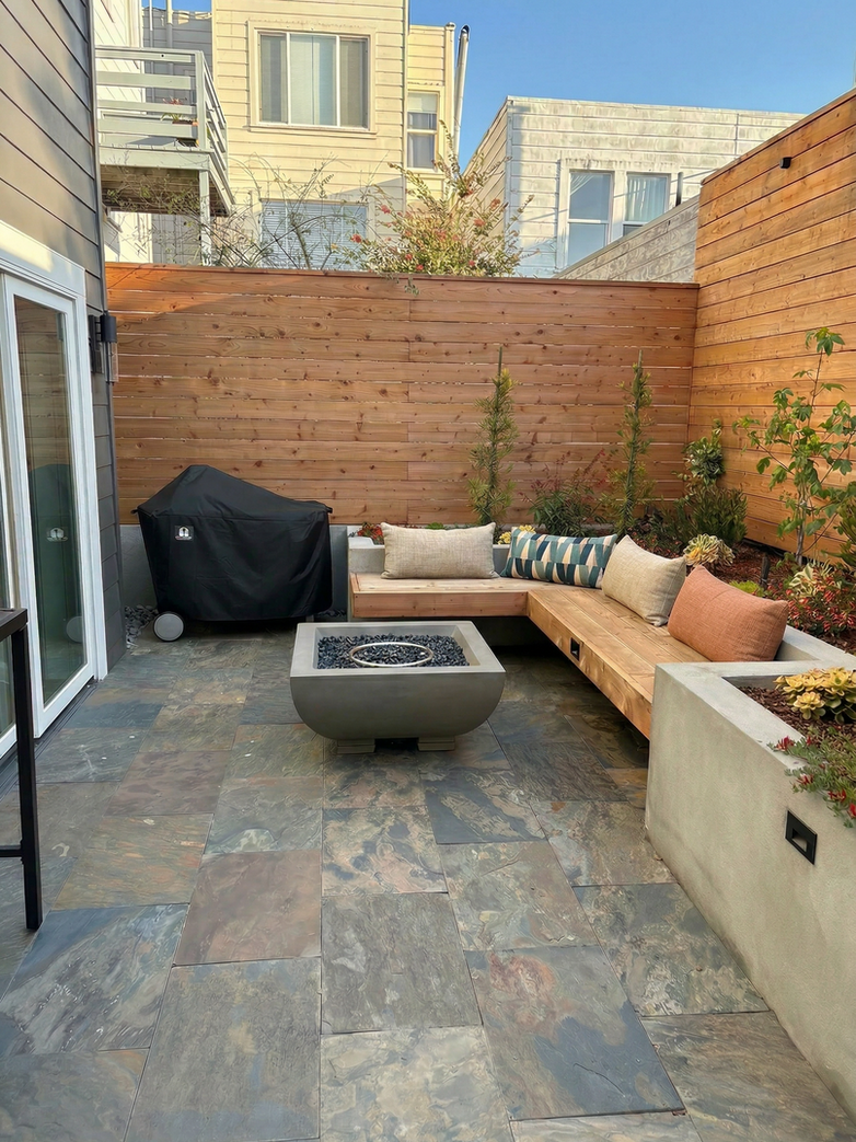 Located in the Inner Sunset of San Francisco, this house had a tiny backyard for this family with 2 kids. It was slightly on an a slope and a pile of dirt with decaying fences and an unsightly neighbors garage along the back. A fence and trellis now cover the wall, and built in planters are perfect for creating a backdrop of plants. Slate stone creates dimension and softness to the space. Two different built ins offer different uses - one for lounging and the other for eating/working/playing games. Lighting allows the space to be used into the evening and enjoyed from inside the house.