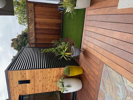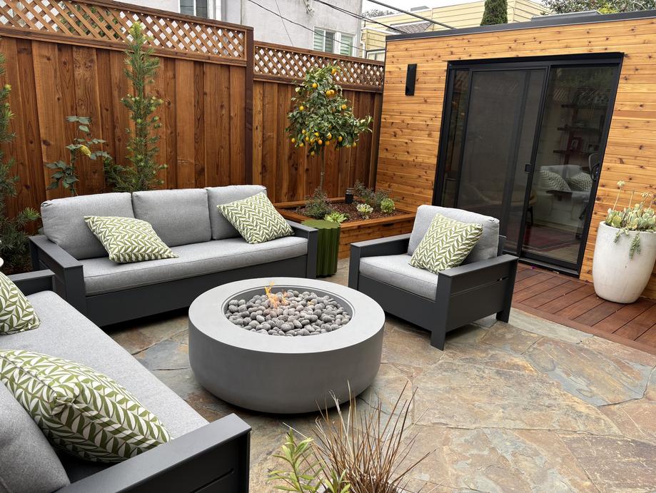 Tucked into a compact San Francisco footprint, this thoughtfully layered garden transforms a small yard into a refined urban retreat. A sleek ADU anchors the space, while custom planter boxes echo the clean lines of an at-grade ipe deck and walkway that seamlessly extend the lower living room outdoors. A slate patio introduces a distinct gathering zone, adding texture and contrast to the contemporary palette.